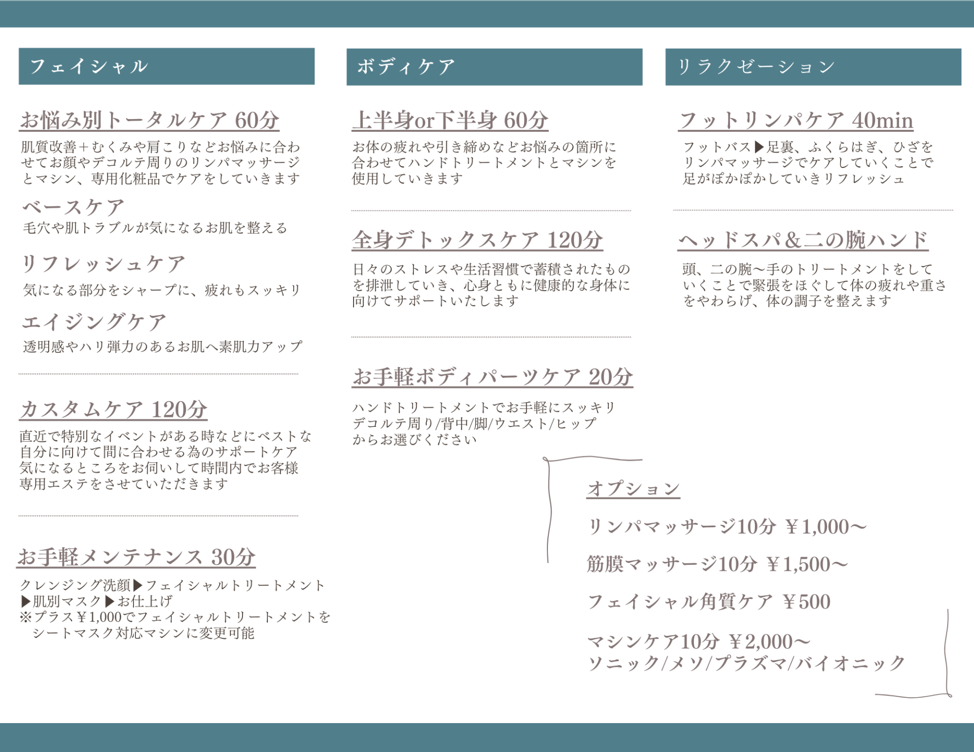 エステは継続的におこなうことで、お客様それぞれのお悩みに対して効果をより感じることができたり自分に合ったケア方法を知っていただくことができますお悩みから少しでも早く解放されるように、また今だけではなくこの先も素敵に年齢を重ねられるようにご来店しやすいお得な回数制プランもございます